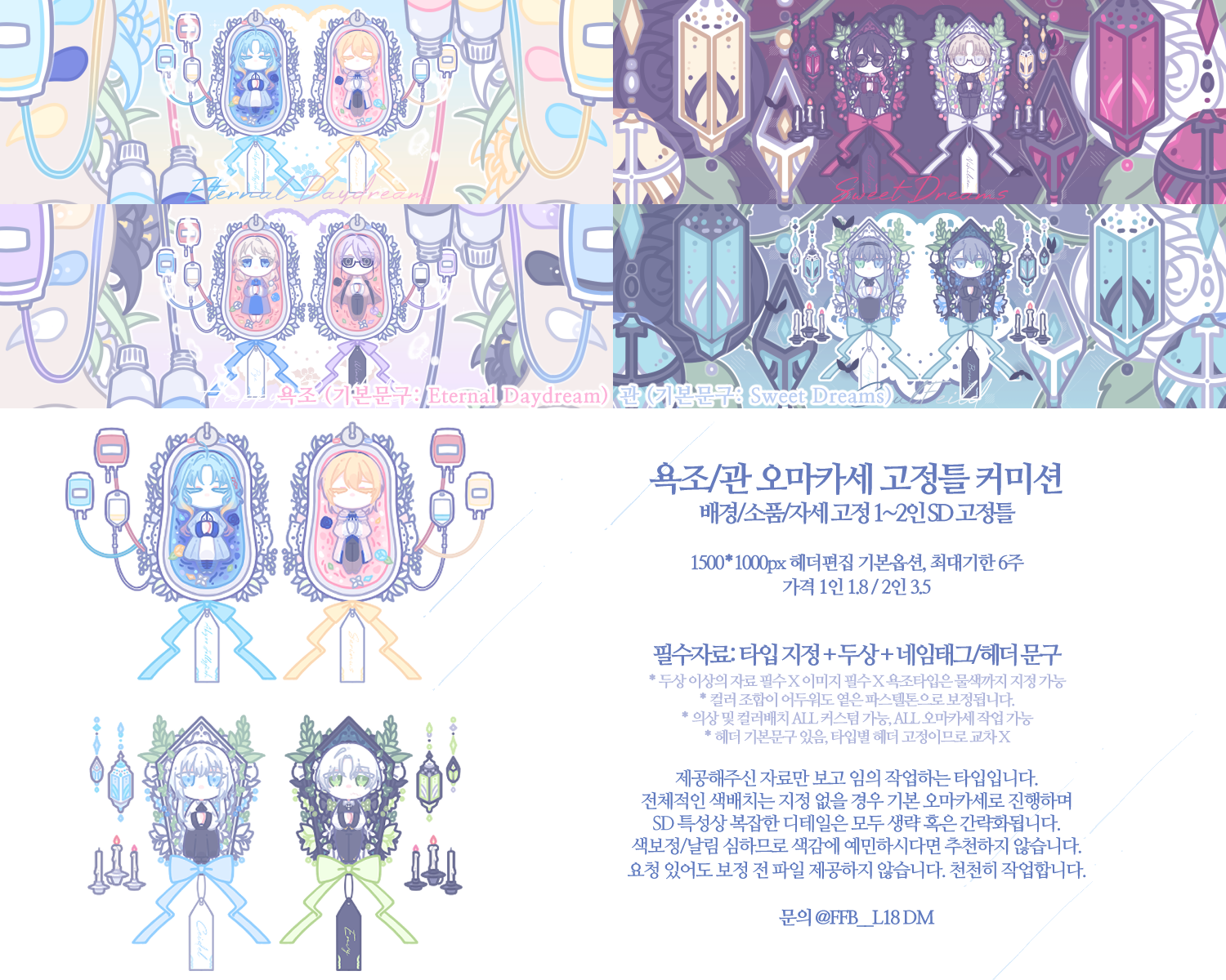 ▶ 동·서양 시대물/SF/판타지/현대풍 등 장르는 가리지 않지만 센스 좋진 못합니다. 테크웨어/시대물 키워드는 퓨전 디자인에 더 강합니다. 아주 화려한 과캐디 디자인을 원하시는 분은 따로 문의 주세요⋯ 내용 협의하고 작업 가능 여부 결정합니다. 완전한 무컨펌 키워드 오마카세 타입으로 디자인 컨펌은 불가합니다.