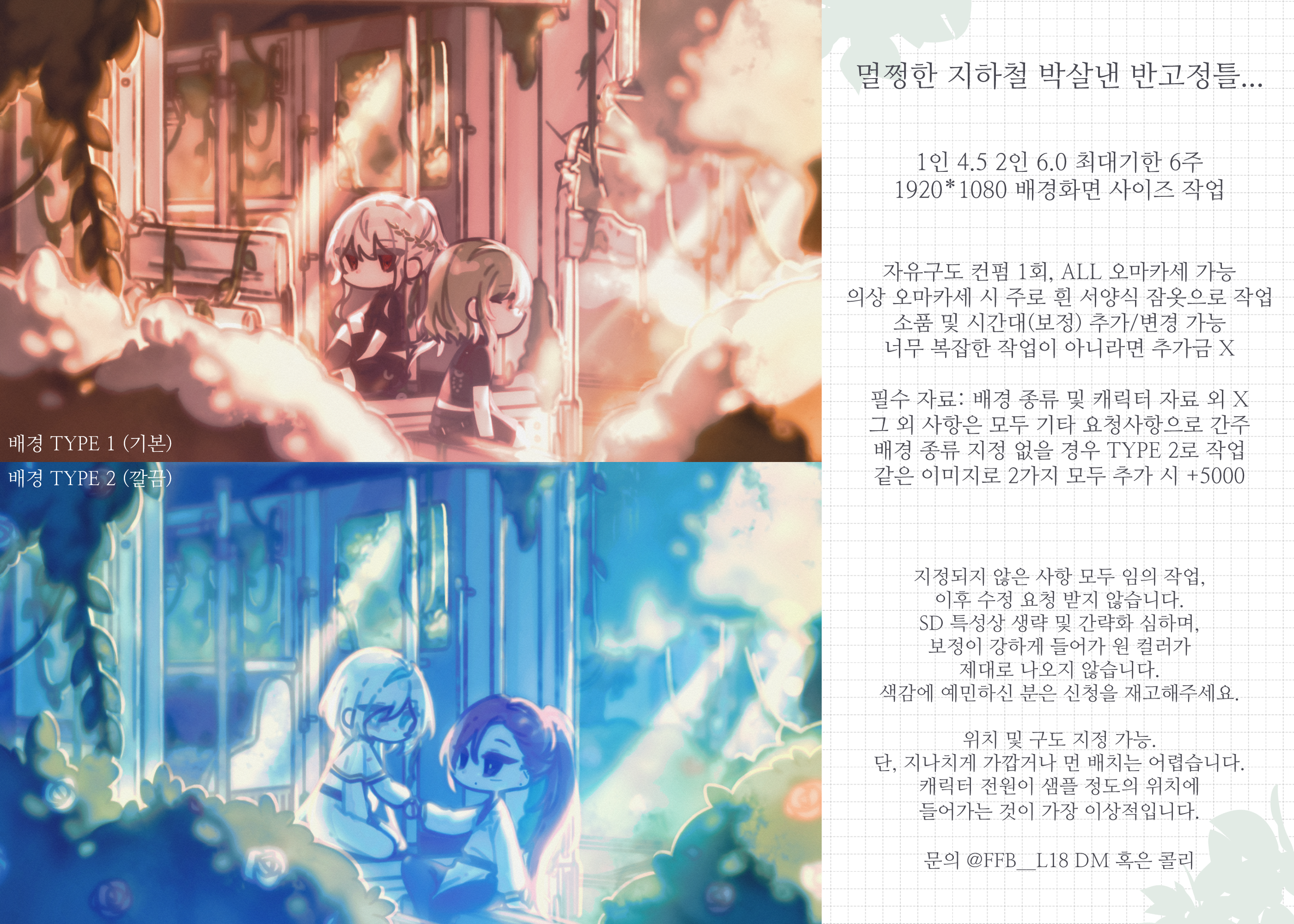 💘 너무 복잡한 작업이 아니라면 소품 및 시간대(보정) 변경 시 추가금이 부과되지 않으며, 이전에 비슷한 요청을 받아 작업한 적이 있을 경우 같은 레이어를 재사용합니다. 데포르메 특성상 디테일 상당 부분 생략되므로 소품 및 악세사리 등 디테일 관련 문의 받지 않습니다.